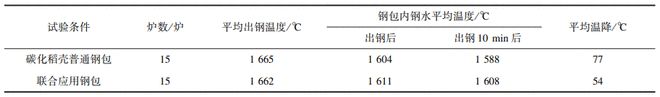 由表4可知,與未加蓋鋼包相比,加蓋后的鋼水溫降平均低14℃。一煉鋼廠經(jīng)過(guò)數(shù)次生產(chǎn)試驗(yàn)發(fā)現(xiàn):鋼包全程加蓋技術(shù)的實(shí)施使鋼水傳輸過(guò)程中的溫降變化較小,鋼包在澆鑄結(jié)束至再次受鋼時(shí)間間隔約30min,包襯溫度≥950℃,比未加蓋鋼包包襯溫度高出30~50℃。采用全程加蓋技術(shù)轉(zhuǎn)爐出鋼溫度可降低15~20℃,上鋼溫度降低10~15℃,有效減少了鋼水等待過(guò)程中的溫降,可大大降低工序成本及工序能耗。4聯(lián)合應(yīng)用效果一煉鋼廠選用32#80t納米絕熱板鋼包,使用SiO2-Al2O3-CaO覆蓋劑,并應(yīng)用鋼包全程加蓋技術(shù)試驗(yàn)其在轉(zhuǎn)爐出鋼10min后鋼包鋼水的保溫效果。出鋼溫度控制在1660±5℃,試驗(yàn)爐數(shù)為15爐,并與普通80t鋼包添加碳化稻殼覆蓋劑時(shí)的溫降作對(duì)比,結(jié)果如表5所示。