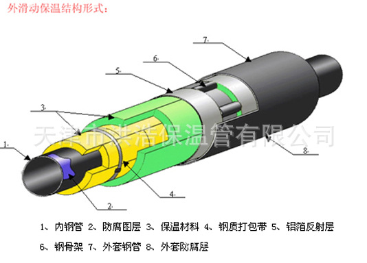 (5)外護(hù)管:保護(hù)保溫層免受地下水侵蝕、支撐芯管并能承受一定壓力的外防護(hù)層。依材料不同,一般分成鋼外護(hù)管、高密度聚乙烯塑料外護(hù)管、玻璃纖維增強(qiáng)塑料外護(hù)管、復(fù)合外護(hù)管等。本產(chǎn)品一般采用鋼管作為外護(hù)管,尤其在高水位或地表水豐富的地區(qū),必須采用鋼外護(hù)管。鋼外護(hù)管材料性能和公差尺寸,符合相關(guān)國(guó)家或行業(yè)標(biāo)準(zhǔn)。鋼管外表面需拋丸除銹處理。(6)防腐層:防止土壤腐蝕的保護(hù)層。本產(chǎn)品一般采用玻璃絲纏繞環(huán)氧樹(shù)脂或特加強(qiáng)級(jí)環(huán)氧煤瀝青防腐結(jié)構(gòu)(三布四油)作為外鋼管的防腐層。特殊情況下,可采用二層結(jié)構(gòu)或三層結(jié)構(gòu)的聚乙烯防腐層。必要時(shí)可輔以“陰極保護(hù)”措施。
