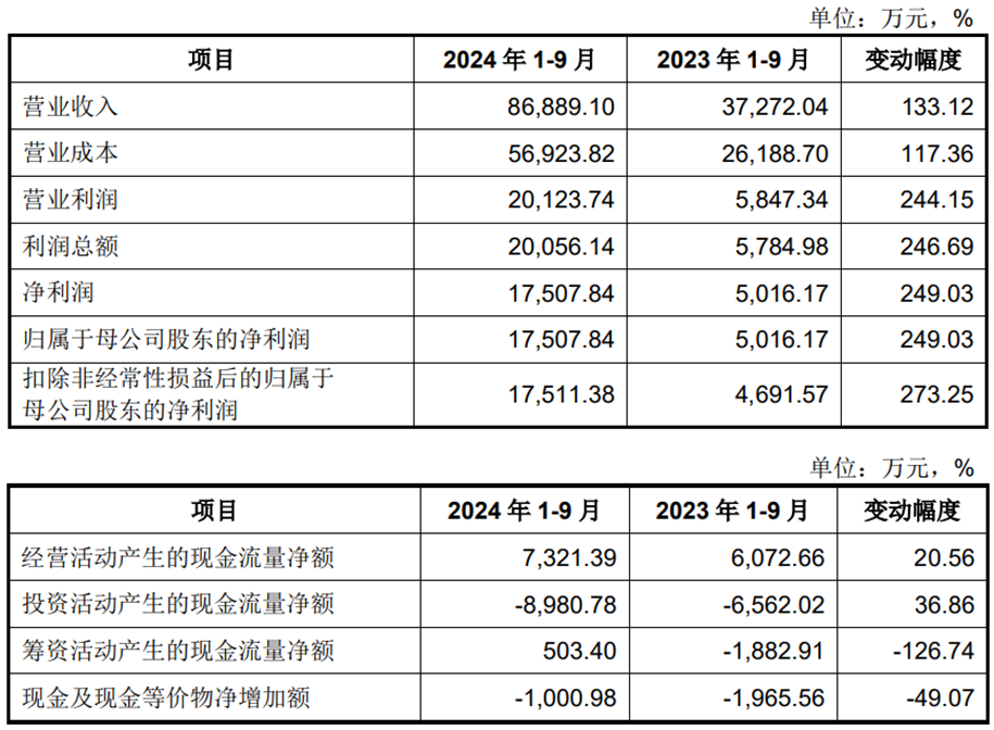 2024年1-9月,先鋒精科實(shí)現(xiàn)營業(yè)收入86,889.10萬元,同比增長133.12%;實(shí)現(xiàn)凈利潤/歸屬于母公司股東的凈利潤17,507.84萬元,同比增長249.03%;實(shí)現(xiàn)扣除非經(jīng)常性損益后的歸屬于母公司股東的凈利潤17,511.38萬元,同比增長273.25%;經(jīng)營活動(dòng)產(chǎn)生的現(xiàn)金流量凈額7,321.39萬元,同比增長20.56%。金年會(huì)官網(wǎng)