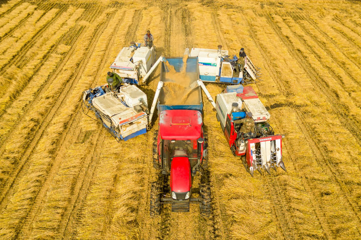 2024年10月13日,在黑龍江省綏化市北林區(qū)雙河鎮(zhèn)稻香村,村民駕駛農(nóng)機(jī)進(jìn)行卸糧作業(yè)(無人機(jī)照片)。新華社記者 張濤攝