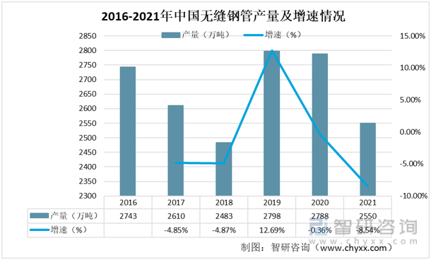 我國已是世界鋼管生產(chǎn)和消費(fèi)大國。無縫鋼管產(chǎn)量超過全球產(chǎn)量65%;出口量占我國無縫鋼管產(chǎn)量15%;占世界無縫鋼管總產(chǎn)量的10%。據(jù)統(tǒng)計(jì),2021年中國無縫鋼管產(chǎn)量大約為2550萬噸,較2020年統(tǒng)計(jì)的2788萬噸減少238萬噸,產(chǎn)量變化在一定區(qū)間內(nèi)震蕩,整體較為平緩。綜合來看,國內(nèi)無縫鋼管產(chǎn)能過剩的情況尤為明顯。