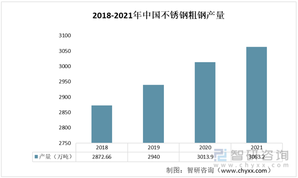 隨著我國經(jīng)濟(jì)的快速發(fā)展、不銹鋼管應(yīng)用市場的持續(xù)繁榮和行業(yè)技術(shù)的日益進(jìn)步,我國不銹鋼管制造業(yè)獲得了長足發(fā)展,隨著工業(yè)化進(jìn)程的推進(jìn),以及不銹鋼下游應(yīng)用領(lǐng)域的不斷增強(qiáng),近年來我國不銹鋼產(chǎn)量穩(wěn)居全球第一,整體保持增長態(tài)勢(shì)。2020年,中國不銹鋼粗鋼產(chǎn)量總計(jì)3013.9萬噸,較上年增加73.9萬噸,同比增長2.5%;2021年,中國不銹鋼粗鋼產(chǎn)量達(dá)3063.2萬噸,較上年增加49.3萬噸,同比增長1.64%。
