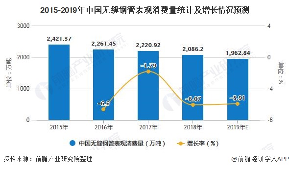 在消費端,船舶制造行業(yè)三大造船指標(biāo)整體呈下降趨勢,汽車產(chǎn)業(yè)近年來產(chǎn)量有所下滑,對我國無縫鋼管消費量產(chǎn)生一定的影響。不過,國際油價提振,國內(nèi)石油開采力度增強(qiáng);以及發(fā)電設(shè)備產(chǎn)量基本穩(wěn)定等,對國內(nèi)無縫鋼管消費量形成一定的支撐。2015-2019年,我國無縫鋼管表觀消費量下滑速度較產(chǎn)量較慢,2019年我國無縫鋼管表觀消費量為1962.84萬噸。