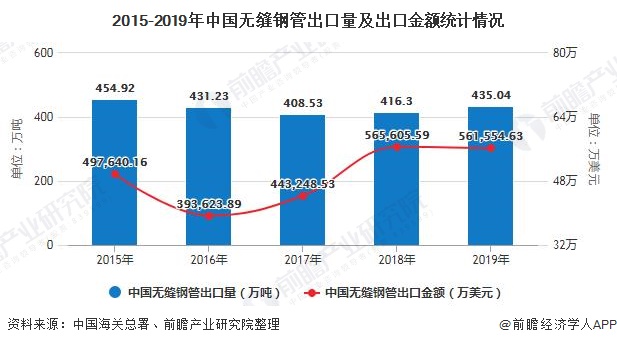 在出口方面,2015-2019年,我國出口無縫鋼管數(shù)量和出口金額均呈現(xiàn)先下降后上升的趨勢,但不同的是,2017年我國出口無縫鋼管數(shù)量持續(xù)下降的背景下,我國無縫鋼管出口金額呈上升趨勢,其主要原因是2017年我國無縫鋼管單價有所提高。2019年,我國無縫鋼管出口量和出口金額分別為435.04萬噸和561554.63萬美元。