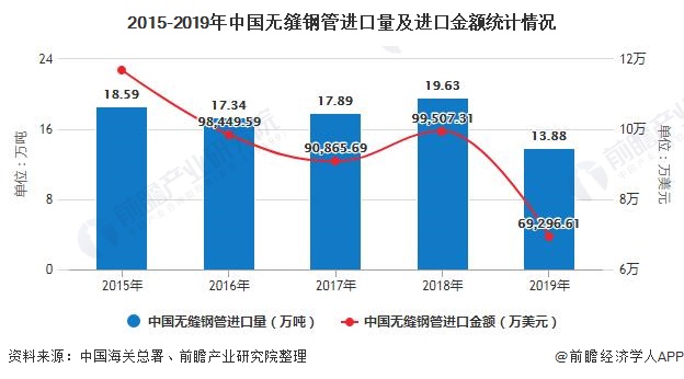 在進(jìn)口數(shù)量上,2015-2018年,我國進(jìn)口無縫鋼管數(shù)量在20萬噸左右;2019年呈現(xiàn)下滑趨勢,進(jìn)口數(shù)量為13.88萬噸。在進(jìn)口金額上,2015-2019年,我國進(jìn)口無縫鋼管金額呈現(xiàn)先下降后上升再下降的趨勢,2019年下滑至69296.61萬美元。