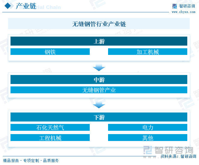 無縫鋼管行業(yè)的上游主要為鋼鐵、加工機(jī)械等產(chǎn)業(yè),上游行業(yè)的技術(shù)開發(fā)能力和加工水平將直接影響到無縫鋼管企業(yè)原材料或半成品的質(zhì)量,乃至整體最終產(chǎn)品的質(zhì)量、成本和使用效果。無縫鋼管行業(yè)下游主要是石化天然氣、電力、工程機(jī)械、金年會(huì)官網(wǎng)船舶、汽車等。