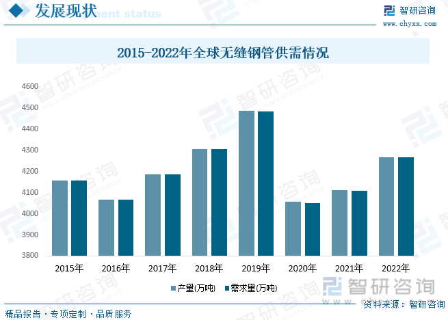 20世紀(jì)90年代國外無縫鋼管生產(chǎn)企業(yè)進(jìn)入整合期,在2000年初形成了5大鋼管生產(chǎn)集團(tuán)(Tenaris集團(tuán)、V&M集團(tuán)、TMK集團(tuán)、日本住友金屬有限公司、日本JFE集團(tuán))。前幾年因?yàn)橐咔榈挠绊懞徒?jīng)濟(jì)下行的沖擊,行業(yè)產(chǎn)需量有所下降,2022年全球無縫鋼管產(chǎn)量為4266.8萬噸,金年會(huì)官網(wǎng)平臺(tái)需求量為4265.8萬噸。