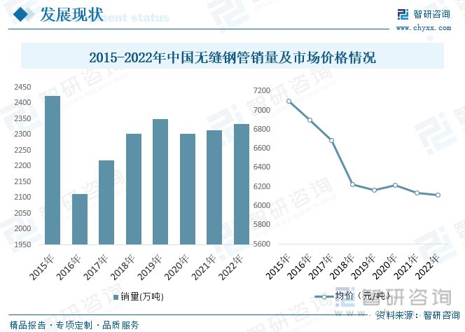 從銷量來看,2022年國無縫鋼管整體銷量約為2333.6萬噸,無縫鋼管的主要原材料為廢鋼和鐵礦石,在生產(chǎn)成本中的占比較高。2015年以來,鐵礦石價(jià)格大幅下降,同時(shí)廢鋼價(jià)格也有所下滑,有利于無縫鋼管生產(chǎn)企業(yè)節(jié)約生產(chǎn)成本。近幾年我國無縫鋼管平均價(jià)格整體呈現(xiàn)下跌趨勢(shì),從2015年的7096元/噸,下跌到2018年的6111元/噸。