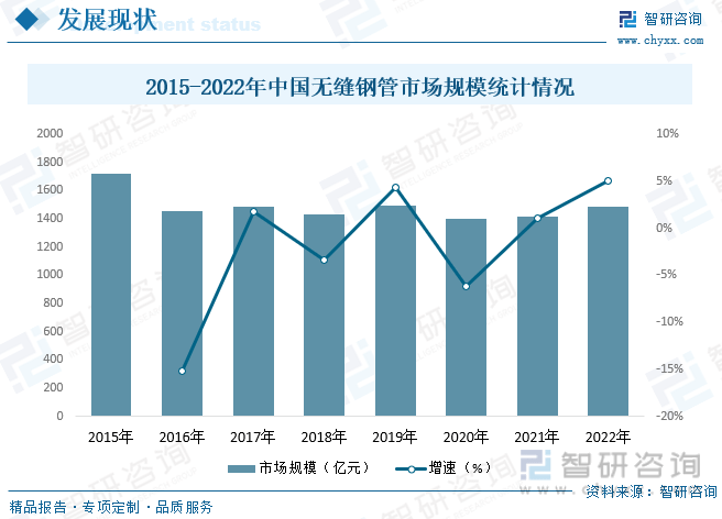經(jīng)過近十年的發(fā)展,我國鋼管行業(yè)在產(chǎn)品結(jié)構(gòu)、質(zhì)量水平、技術(shù)裝備等方面不斷得到優(yōu)化提升,已成為名副其實(shí)的世界鋼管制造大國,目前正在向世界鋼管工業(yè)強(qiáng)國邁進(jìn)。但是,我國鋼管行業(yè)發(fā)展過程中的階段性矛盾和結(jié)構(gòu)性矛盾已經(jīng)顯現(xiàn),成為阻礙鋼管行業(yè)持續(xù)、健康、穩(wěn)定發(fā)展的“瓶頸”,鋼管行業(yè)的深度調(diào)整仍在進(jìn)行之中。2022年國無縫鋼管市場(chǎng)規(guī)模為1488.6億元,同比增長(zhǎng)4.98%。