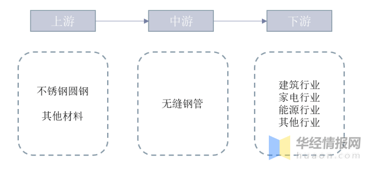 無(wú)縫鋼管產(chǎn)業(yè)鏈上游是原材料,主要包括不銹鋼圓鋼以及其他金屬等材料;中游是無(wú)縫鋼管生產(chǎn)供應(yīng)商;產(chǎn)業(yè)鏈下游主要應(yīng)用在建筑行業(yè)、家電行業(yè)、能源行業(yè)。