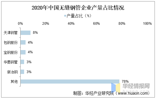 隨著我國(guó)經(jīng)濟(jì)的不斷發(fā)展,我國(guó)的鋼管生產(chǎn)企業(yè)會(huì)通過(guò)不斷的考察市場(chǎng)、拓展企業(yè)出口、完善自身發(fā)展來(lái)適應(yīng)我國(guó)當(dāng)代市場(chǎng)經(jīng)濟(jì)的發(fā)展需求。從產(chǎn)量競(jìng)爭(zhēng)格局來(lái)看,我國(guó)無(wú)縫鋼管行業(yè)市場(chǎng)集中度低。據(jù)統(tǒng)計(jì),2020年中國(guó)無(wú)縫鋼管產(chǎn)量TOP3分別是:天津鋼管8%、包鋼股份4%、寶鋼股份4%。