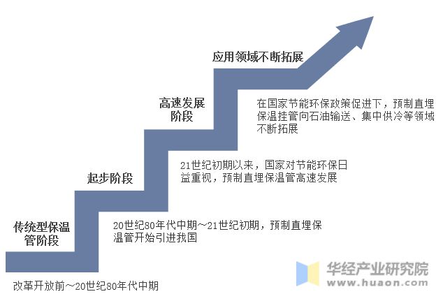 金年會2022年中國預(yù)制直埋保溫管行業(yè)發(fā)展歷程、產(chǎn)業(yè)鏈、市場規(guī)模及供需現(xiàn)狀分析「圖」預(yù)制直埋保溫管是以工作鋼管作為基礎(chǔ),經(jīng)絕熱保溫處理和加工后的管類產(chǎn)品,具有優(yōu)異的絕熱保溫性能。 與傳統(tǒng)的保溫管相比具有綜合造價低、施工方便的特點(diǎn),可用于液體、氣體及其他介質(zhì)的輸送,如應(yīng)用于石油、化工、集中供熱、中央空調(diào)、市政等管道的絕熱保溫工程。 縱觀我國預(yù)制直埋保溫管行業(yè)發(fā)展歷程,經(jīng)歷了以下幾個發(fā)展階段:
