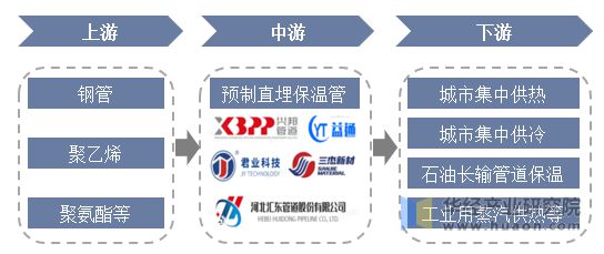 預(yù)制直埋保溫管產(chǎn)業(yè)鏈上游主要包括鋼管、聚乙烯、聚氨酯等原材料,下游廣泛應(yīng)用于城市集中供熱、城市集中供冷、工業(yè)用蒸汽供熱、石油長輸管道保溫等領(lǐng)域。