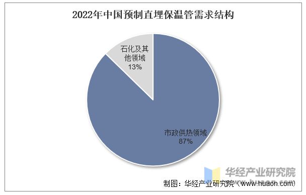 目前,預(yù)制直埋保溫管行業(yè)客戶主要是市政、化工等領(lǐng)域。市政供熱領(lǐng)域仍然我國是預(yù)制直埋保溫管最大的細(xì)分需求市場,2022年該領(lǐng)域占比達(dá)87.30%。